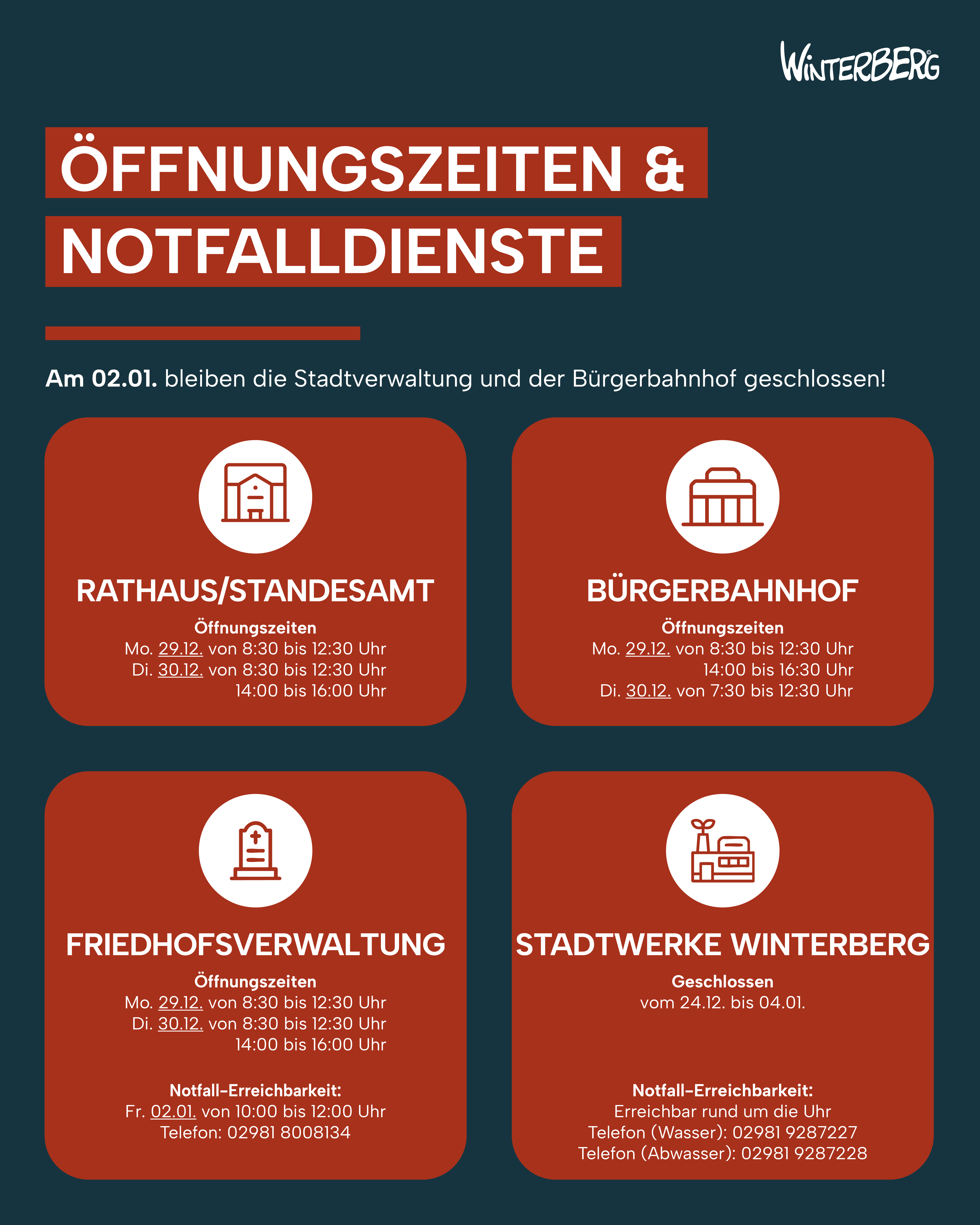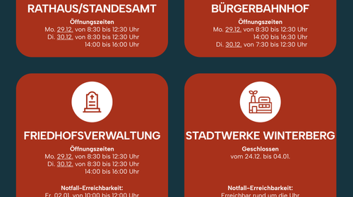 Stadtverwaltung und Stadtwerke Winterberg informieren über geänderte Öffnungszeiten und erreichbare Notdienste in der Zeit vom 24. Dezember bis zum Jahreswechsel. Bürgerinnen und Bürger werden gebeten, ihre Anliegen nach Möglichkeit frühzeitig zu planen.